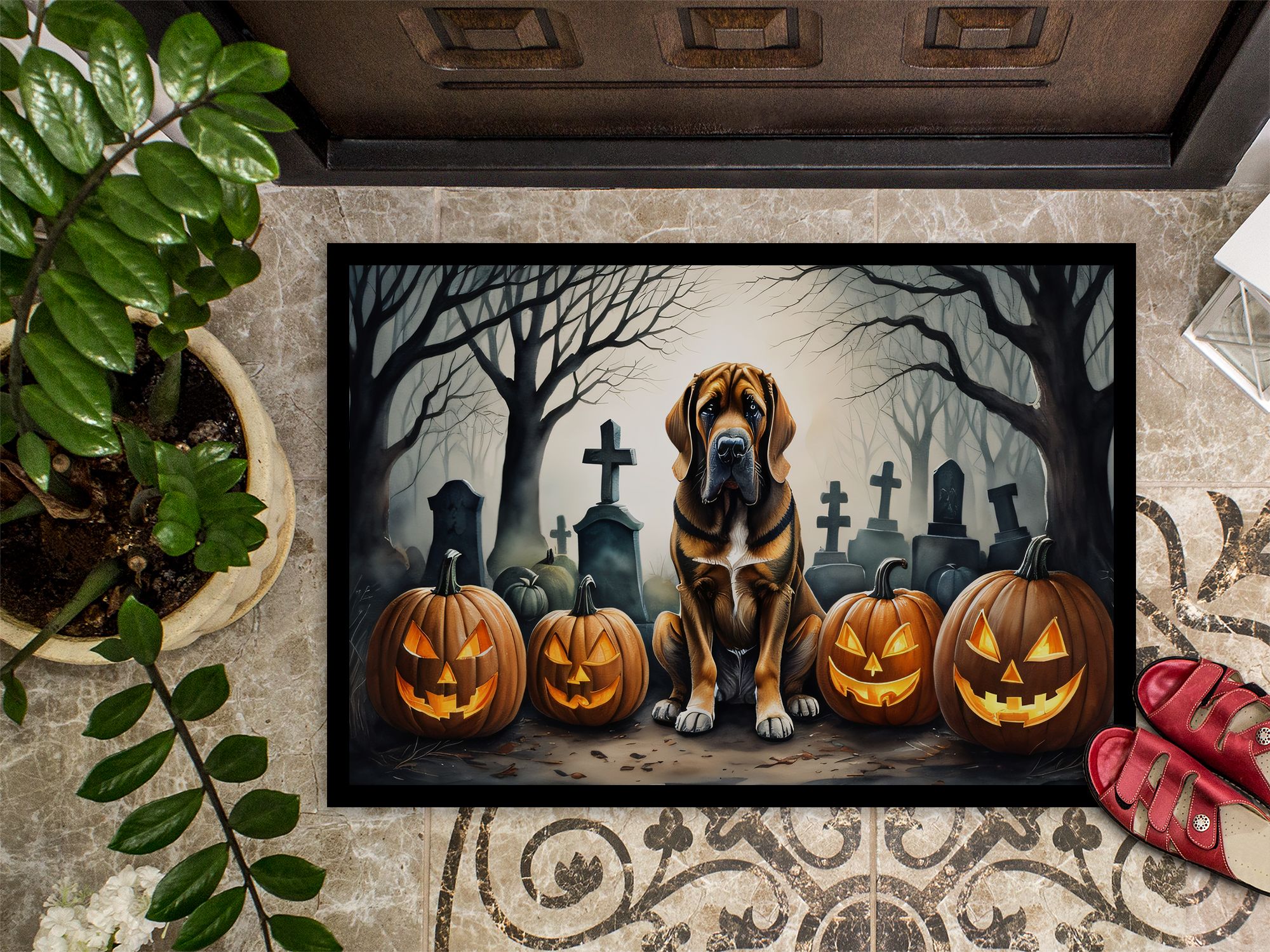 Doormat featuring breed specific Bloodhound artwork. Celebrate Halloween with this Halloween Doormat. Welcome your guests in style with our Artwork Door Mat, designed to withstand almost any weather condition. This mat, measuring approximately 18 by 27 inches, is held together by durable black binding tape. Its top layer, composed of polyester felt, is dyed with the eye-catching image you see on the mat. A few layers below provide the mat with stability, while its rubber bottom is stamped to help prevent slipping and ensures safety. Our mat works wonderfully as both an indoor or outdoor door mat. For cleaning, simply hose it off with water or use a power washer - no need for any cleaner that produces suds. Avoid scrubbing with a brush, instead, opt for the vacuum on floor setting. Designed manufactured and printed in the USA, this mat is a perfect addition to your porch, outdoor kitchen, entryway, or any indoor space. Its unique design makes it a charming decorative rug that greets your guests and adds a stylish touch to your home decor.